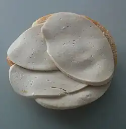 Gelbwurst was invented in 1905 and is made from pork, veal, and a combination of spices such as ginger and nutmeg. Traditionally, the sausage contained brains, though this is no longer the case, it is still sometimes referred to as Hirnwurst ("brain sausage") in certain parts of Germany.[2][3] Gelbwurst is yellowish-white and usually has a yellow or orange rind around its edge. It is often served as cold-cuts on slices of bread.[4] Today the addition of brains is uncommon, the consumption of animal brains having fallen out of consumer preference. The use of bovine brains has been banned since the BSE crisis in 2000.[5]