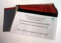 The Gemeinsame Körperschaftsdatei or GKD (translated as Corporate Bodies Authority File) is a German authority control for the organisation of corporation names (corporate bodies) from catalogues. It is used mainly for documentation in libraries. Like the Schlagwortnormdatei (SWD) (English: Subject Headings Authority File) and the Personennamendatei (PND) (English: Name Authority File), the GKD is looked after and updated by the German National Library (DNB), the Bavarian State Library, the Berlin State Library and, since 1997, the Austrian National Library, several library networks taking part. The responsible editor is the State Library in Berlin. The GKD was created in the 1970s from the catalogue data of the Zeitschriftendatenbank (ZDB). In April 2004, it contained more than 915,000 records.