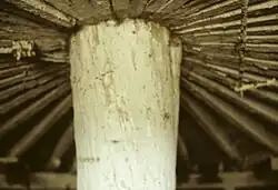 The barn is a round basement barn, 68 feet in diameter. In the center of the bottom level, on a base of concrete blocks, stands the trunk of an old oak tree which rises 9 feet to support the mow floor. This trunk is upside down, 2.5 feet across at the bottom and 3 feet across at the top, providing a larger surface for attaching the 3x10 joists that radiate out and support the mow floor. The outside wall has a limestone foundation almost two feet thick. Above, the barn is clad in horizontal wood siding bent to the curve of the barn. The floor of the basement was originally dirt. The second floor is a hay mow, accessed through sliding doors on the north side. 18-foot studs rise to support a conical roof with rafters leading up to a collar beneath the central cupola on top of the roof. The original roof was clad in wood shingles; they have since been covered with asphalt.[2]