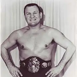 After retiring from football, Kiniski trained with Dory Funk and Tony Morelli for a wrestling career, eventually making his pro debut on February 13, 1952, in Tucson, Arizona, where he defeated Curly Hughes.[5] Kiniski's first exposure on television was in Southern California in 1954 alongside other wrestlers such as Wilbur Snyder and Bobo Brazil. One year later, he teamed up with John Tolos to win his first major championship, the International TV Tag Team title, in Los Angeles, then challenged NWA World Champion Lou Thesz in November 1954.[4] As an emerging talent, Kiniski got the opportunity to wrestle Lou Thesz at the Olympic Auditorium on November 3, 1954. Kiniski lost in two straight falls.[4]