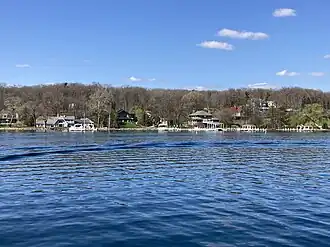 A shorepath, which is open to the public, completely surrounds the lake.[7][8][9] Between 21 and 26 miles (34 and 42 km) long,[8][9][7] it follows the route taken by Potawatomi Indians.[7] The path crosses the estates of the Schwinns, Swifts, Wackers, and Wrigleys.[7]