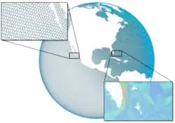 A geodesic grid is a global Earth spatial reference that uses polygon tiles based on the subdivision of a polyhedron (usually the icosahedron, and usually a Class I subdivision) to subdivide the surface of the Earth. Such a grid does not have a straightforward relationship to latitude and longitude, but conforms to many of the main criteria for a statistically valid discrete global grid.[9] Primarily, the cells' area and shape are generally similar, especially near the poles where many other spatial grids have singularities or heavy distortion. The popular Quaternary Triangular Mesh (QTM) falls into this category.[10]