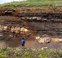 Layers of sedimentary rock cut by a normal fault (due to extension of the bedrock) near Tbilisi. Layers on the right have moved downwards relative to layers on the left.