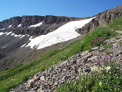 All Pinedale glaciers probably melted away soon after the start of the Holocene epoch. The dozen small cirque glaciers seen today were formed during a subsequent neoglaciation 5000 years ago.[21] Mount Moran has five such glaciers with Triple Glaciers on the north face, Skillet Glacier on the east face, and Falling Ice Glacier on the southeast face. All the glacial action has made the peaks of the Teton Range jagged from frost wedging. Other glaciers include Teton Glacier, below the east face of Grand Teton, Middle Teton Glacier, situated on the northeast slopes of Middle Teton, and the fast retreating Schoolroom Glacier, west of Grand Teton at Hurricane Pass.