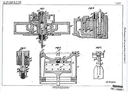 In 1872 George Brayton patented a constant pressure internal combustion engine, initially using vaporized gas but later using liquid fuels such as kerosene and oil, known as Brayton's Ready Motor,[1][2] The engine used one cylinder for compression, a receiver reservoir, and a separate power/expander cylinder in which the products of combustion expanded for the power stroke. The significant difference from other piston driven internal combustion engines is that the two cylinders are arranged so that the fuel/air mixture burns progressively at constant pressure as it is transferred from the compressor cylinder and reservoir to the working/expansion cylinder. In the original version a gas/air mixture was created by a vapor carburetor,[3] then compressed and stored in a reservoir where it was ignited and then introduced into an expansion cylinder. A metal gauze/mesh was used to prevent the combustion running back to the reservoir. However at times the mesh failed, leading to flash-back or explosion. In 1874 Brayton filed a patent for a liquid fuel injection system. In this version, fuel was introduced as the air passed into the expansion cylinder, thus eliminating the explosion problem.[4] Ignition remained a pilot flame. The principle was referred to as constant pressure combustion, and had been attempted without success by Sir William Siemens c1861 using a 4-cylinder engine with a separate combustion chamber. Brayton not only achieved success in making the constant pressure cycle work, but he also made and marketed a commercial product.