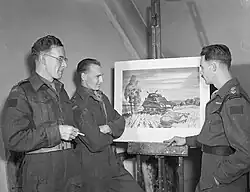 ![]() George Campbell Tinning (left), war artist, at art exhibition, Horsham, England, August 23, 1945. (L-R) Capt. G. Campbell Tinning, Lt. Bruno J. Bobak, Capt. Lawren P. Harris. | |