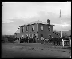 In early 1878 the Moonlights bought the Commercial Hotel in Hampden for £900. Most of the buildings of Hampden were situated on the low-lying land at the junction of the Buller and Matakitaki. In May 1878 heavy rains brought a terrible flood, where the streams of the Matakitaki and Buller cut into the land on which the township was built. The flood carried away the Moonlights’ stabling, almost completely demolished their house, and the Commercial Hotel was damaged beyond repair. George rebuilt it away from the river, up in the bush on what would become the future site of Murchison (renamed from Hampden in 1883), but the rebuild cost him dearly. The fenced complex included a larger Commercial Hotel as well as a smithy, butchery and store. There was much felling and stumping of trees to be done. He also had to replenish his stocks, his carting equipment, and rebuild his stables.[42][43][44][45]