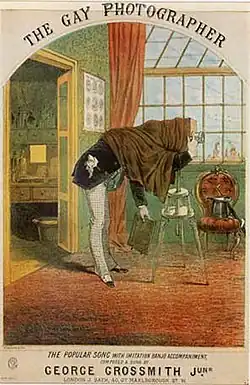 Grossmith took to the professional stage in 1870 with a sketch called Human Oddities, written by his father, and a song called "The Gay Photographer" (that is, the "carefree" photographer).[7] The song, with words by Grossmith's father and music by young Grossmith, concerns a photographer who broke the heart of a young lady named Miss Jenkins; so she drank his chemicals and died.[8] In late 1870, the younger Grossmith appeared on his own with a nightly spot at the "old Polytechnic" in Regent Street, where comic sketches alternated with scientific and serious lectures for the entertainment of the public.[5] Human Oddities and another sketch, The Yellow Dwarf, were successful for Grossmith, and he took the former work on tour for six months. An 1871 Grossmith sketch was called He was a Careful Man.[7] Biographer Tony Joseph notes that, except for a few early pieces, nearly all of Grossmith's material was written and composed by Grossmith himself. Joseph describes the sketches as "a light-hearted sending up of various aspects of contemporary life and manners. ...he was the complete performer... as a pianist (he performed for the most part sitting at a piano)... as a raconteur... as a mimic, facial expression, timing—he had it all. A short, dapper figure, he turned his lack of inches to positive advantage, and audiences took to him everywhere."[1]