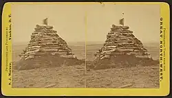 In a letter dated October 29, 1878, Major George D. Ruggles, acting adjutant general, Department of Dakota, directed Lieutenant Colonel George P. Buell, commanding officer of Fort Custer, to send an expedition to the Little Bighorn to secure all human bones within a cone or pyramid of stones, adding, " The Department Commander thinks that the most suitable location for the grave is the highest point of the ridge just in rear of where General George Custer's body was found."[12]