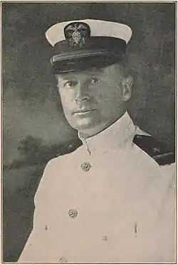 On May 7, 1917, he left the naval militia and enrolled in U.S. Naval Reserve Force as an Ensign. He was ordered overseas on August 16, 1917, and was put in charge of the American aviators training at the French flying school in Gironde. Later that year, he was transferred to the U.S. Naval Aviation Headquarters in Paris. He was commissioned a Lieutenant (junior grade) on February 1, 1918, and promoted to Lieutenant a month later. He was made liaison officer with United States Army Air Service and later made Chief of Aviation, U.S. Naval Aviation Foreign Service. He was transferred to London when the U.S. Naval Aviation Headquarters was moved there and was the head of the planning section there. He was promoted to Lieutenant commander on September 30, 1918, and was placed on inactive duty on January 14, 1919.[26]