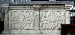 The chest tomb of George Slee survives in St Peter's Church, Tiverton. The sides of the chest tomb are decorated with strapwork panels, and Caryatids.[8] The thick marble ledger stone on top is deeply inscribed in Gothic lettering as follows:[9]