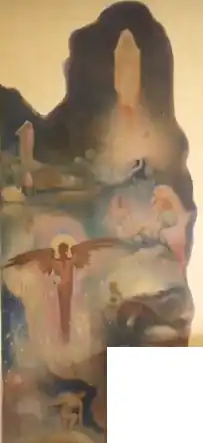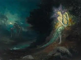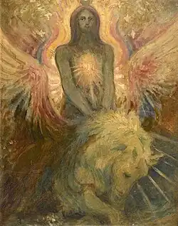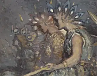 He claimed to see nature spirits and made paintings about them, such as the sídhe, elven or faerie beings in Irish folklore.[19][20] On one occasion, he showed some drawings he had made of them to a peasant, who would have pointed out that he had already seen many of those entities.[20] In 1889 he had traveled with W. B. Yeats to a town in County Galway, where Russell also painted these spirit beings, and a Druid is said to have appeared to them in vision.[21] The previous year, in a letter to Yeats, Russell had stated:
