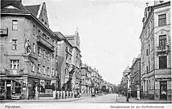 The Georgenstraße formed, for a long time, the northernmost east-west road on Munich city, in front of the Burgfriedensgrenze to the, then independent, village of Schwabing. From the address book for Munich of 1859, houses numbered 1 to 17 were listed.[3]