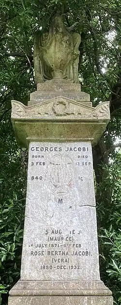 On his death in 1906 Jacobi was buried on the west side of Highgate Cemetery, London. In his will he left £4039 7s 6d to his widow.[10]