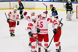 In October 2015 Georgia participated in the first game of the 2018 Winter Olympic qualification tournament, against Bulgaria, losing the match 9–1.[12] Funding from the Georgian government came for the first time in 2015; prior to that the players and management had to pay all expenses.[7] In the 2016 Division III tournament, they finished second after winning four games out of five, only losing to Turkey 5–4, and having the tournament's leading scorer, Boris Kochkin (who had 10 goals and 9 assists).[13] However, all their matches were later nullified and the results recorded as 5–0 forfeits due to Georgia's use of ineligible players.[14] At the 2017 Division III tournament they placed third, winning three of their five games.[15] Five Georgians placed in the top ten scorers, including Artem Kozyulin in first with 25 points (13 goals and 12 assists), while Artem Kurbatov was named the tournament's best defeceman.[16][17] In the 2018 Division III tournament, they finished first after winning four games out of five, losing one game to South Africa 4–2. Five of the top ten scorers in the tournament were from the Georgian team, including Aleksandr Zhuzhunashvili, who led the tournament in goals (10), assists (9), and points (19), and was named the best forward.[18][19] For the first time, Georgia earned promotion to Division IIB for 2019. The result was attributed to a policy of naturalization: three of the top five scorers had Russian or Ukrainian surnames, while all five learned hockey outside of Georgia.[20] The result had Georgia place 40th in the IIHF World Ranking, their highest spot to date.[21]