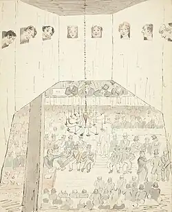 In 2015, an archivist from the Dering collection at the Shakespeare Birthplace Trust found a sketch in one of Rebecca Dering's sketchbooks that was drawn by Georgiana herself. It was found with two tickets to Westminster Hall for 11 July 1821, about nine years before Rebecca Dering was born. The sketch itself is a drawing of eight women with their heads sticking through the windows of the Parliament building while it is in session.[13] Women used to gather in the space above the ceiling and listen in, since they were not allowed to participate and be present during a session. The drawing is presented from Georgiana's point of view as she is able to see the other women at her level also looking down on the structure beneath. The assumption that Georgiana drew this sketch is due to her elevated social position, allowing her to travel to Westminster and acquire tickets to enter the House of Commons. This drawing is significant because it shows how women politically engaged, whether it was from listening from a ventilator in the ceiling or persuading men to vote for local leaders. Though such women as Lady Chatterton were often able to influence politics, they could only do so indirectly, still managing to make their mark on a world almost a hundred years before female suffrage was achieved in the United Kingdom.