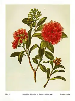 Hetley went to England to seek a publisher, receiving assistance along the way from authorities at Kew, and the chromolithographs were ultimately produced in 1888 by Leighton Brothers. The plates also had the distinction of being published in a French edition a year later.[6][1] The inclusion in the book of Loranthus adamsii is notable as this native mistletoe was discovered by Mr James Adams of the Thames goldfields shortly before it became extinct. Without the work of botanical artists such as Hetley there would be no record of what this plant truly looked like.[5] While in London, her work was exhibited at the Colonial and Indian Exhibition.