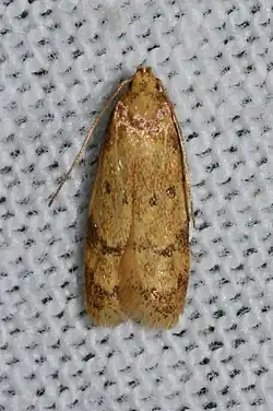 The wingspan is 13–17 mm. The forewings are light yellow, suffused with darker saffron-yellow. The basal half of the costal edge is darkened with black dusting. The hindwings are whitish fuscous.[2] Adults are mainly on wing from June to August.