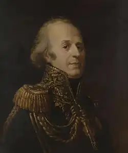 During Napoleon's invasion of Russia, de Staël, her two children, and Schlegel travelled through Galicia in the Habsburg empire from Brno to Łańcut where de Rocca, having deserted the French army and having been searched by the French gendarmerie, was waiting for her. The journey continued to Lemberg. On 14 July 1812 they arrived in Volhynia. In the meantime, Napoleon, who took a more northern route, had crossed the Niemen River with his army. In Kyiv, she met Miloradovich, governor of the city. De Staël hesitated to travel on to Odessa, Constantinople, and decided instead to go north. Perhaps she was informed of the outbreak of plague in the Ottoman Empire. In Moscow, she was invited by the governor Fyodor Rostopchin. According to de Staël, it was Rostopchin who ordered his mansion in Italian style near Winkovo to be set on fire.[94] She left only a few weeks before Napoleon arrived there. Until 7 September, her party stayed in Saint Petersburg. According to John Quincy Adams, the American ambassador in Russia, her sentiments appeared to be as much the result of personal resentment against Bonaparte as of her general views of public affairs. She complained that he would not let her live in peace anywhere, merely because she had not praised him in her works. She met twice with the tsar Alexander I of Russia who "related to me also the lessons a la Machiavelli which Napoleon had thought proper to give him."[95]