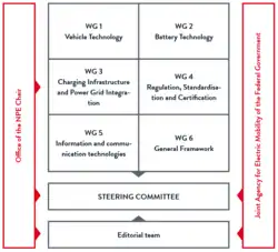 The platform consists of the steering committee, an editorial team and six topic-specific working groups. The steering committee coordinates the working groups. It is the decision-making body and reflects the structure of the NPE, which is made up of members of economy, science, politics and associations. Its members are the chairmen of the working groups, representatives of the federal government, the industrial circle electric mobility and the members of the editorial team. The editorial team supports the steering committee in the elaboration of reports and other publications of the NPE. The NPE is supported by the Federal Government's Joint Agency for Electric Mobility (GGEMO). The Office of the NPE Chair moderates the platform and coordinates the NPE communication.