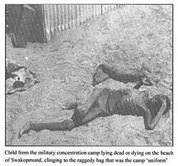 The neighbouring British objected to what they regarded as the inhumane German policy. This involved maintaining a number of concentration camps in the colony during their war against the Herero and Nama peoples. Besides these camps, the indigenous people were interned in other places. These included private businesses and government projects,[12] ships offshore,[13][14][15] Etappenkommando in charge of supplies of prisoners to companies, private persons, etc., as well as any other materials. Concentration camps implies poor sanitation and a population density that would imply disease.[16] Prisoners were used as slave labourers in mines and railways, for use by the military or settlers.[17][18][19]