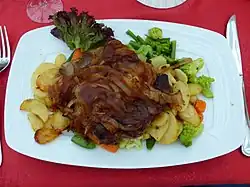 Vegetables are often used in stews or vegetable soups, but are also served as side dishes. Carrots,[15] cauliflower,[16][17] turnips,[18] spinach,[19] peas,[20] beans, broccoli and many types of cabbage are very common.[17][21] Fried onions are a common addition to many meat dishes throughout the country. Circa 1900, carrots were sometimes roasted in water, with the broth used in place of coffee.[22]