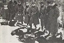 Frank's decree of October 15, 1941 stipulated that cases of aid to Jewish refugees would be dealt with by German special courts. Until 2014, historians were able to identify 73 Polish citizens, against whom special courts of the General Government conducted cases in this respect. Many times, however, the Germans refused to carry out even simplified court proceedings, and the Jews captured together with their Polish caregivers were murdered on the spot or at the nearest police station or military police station.[1][16] Such a course of action was sanctioned, among other things, by a secret order of the SS Commander and the Police for the Radom district, ordering the extermination of captured Jews and their Polish caregivers on the spot, as well as the burning of buildings where Jews were hidden. At the same time, the Germans took care to give proper publicity to their retribution, so as to intimidate the Polish population and discourage it from providing any aid to Jews. For this purpose, the victims' burials were prohibited in cemeteries; instead, they were buried at the scene of the crime, on nearby fields or in road trenches.[8]