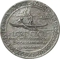 The successful completion of this first voyage was commemorated with a tongue-in-cheek medal created by German artist Ernst Zehle, with a dedication to the British Lord Robert Cecil, responsible for the blockade, on the front. On the reverse is a beaver swimming under some fishermen's nets with the phrase "Don't go over! Go under!"