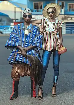 The Ghanaian Smock or Tani is a fabric worn by both women and men in Ghana.[1] It is the most popular traditional attire in the country. The fabric is called Tani in Dagbani, while the male and female wear are respectively called Bin'gmaa and Bin'mangli. The smock is formally worn with a hat (zipligu)/ scarf (bobga), footwear (muɣri), and a trouser (kurugu).[2]