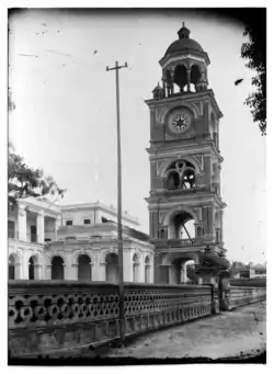 The Ghanta Ghar (घन्टाघर), situated in the capital city of Kathmandu, is the oldest clock tower of Nepal. It lies in front of Rani Pokhari and near Trichandra College. It was built by Rana Prime Minister Bir Shumsher. The original clock tower was designed after Big Ben of London, as Western influence crept into Nepalese architecture during the Rana era. The GhantaGhar that stands today was rebuilt after the 1990 BS earthquake, standing on the site of the original after the old tower was destroyed by the earthquake.[1][2][3]