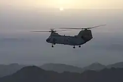 A U.S. Marine Corps CH-46 Sea Knight helicopter flies over the mountains of Kohistan, en route to Ghazi Aviation Base, Pakistan