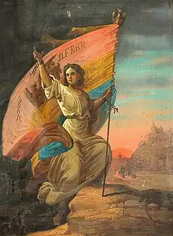 Tattarescu was a participant in the 1848 Revolution in Wallachia. After the revolution, he painted portraits of Romanian revolutionaries in exile such as Gheorghe Magheru, Ştefan Golescu, and, in 1851, that of Nicolae Bălcescu (in three almost identical versions). Romantic nationalist ideals were the inspiration for his allegorical compositions with revolutionary themes in Romania's rebirth (1849), the patriotic Principalities' Unification (1857) and February 11 – The Modern Romania (1866).[1]