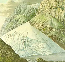 After an increase of the glacier during the "Year Without a Summer", an ice cone started to form in 1816 in the valley.[2] It was created by the accumulation of the falling seracs of the terminus. A lake was formed but it emptied on 27 May 1817 without causing any fatalities. In April 1818 the lake measured about 2 km in length. On 10 May 1818, the engineer Ignaz Venetz was called by the canton.[2] To stop the rapid rise of waters, he decided to drill a hole through the ice. The work began one day later. A tunnel was drilled from the two sides, about 20 metres above the level of the lake. An avalanche of ice occurred on 18 May but without any casualties. A secondary tunnel was then drilled for safety reasons. A week later the level of the lake reached 10 metres below the tunnel.[2] On 27 May an enormous piece of ice detached itself from the cone in the lake and floated to the surface while making terrible noise; everybody escaped. They went back to work two days later. The 198 metre-long hole was completed on 4 June.[2] Other large pieces of ice detached from the cone and floated back. The waters finally reached the level of the hole on 13 June, 22:00. They continued to rise until 14 June, when the level of the lake began to fall because of the erosion of the hole by the waterfall. Some water also ran out from the base of the cone.[2] Only two men stayed in place; Venetz warned the inhabitants of the valley of the danger. On the morning of 16 June, terrible noises and violent detonations were heard. The cone began to crack. A group of British tourists and a drawer from Lausanne visited the place with Venetz. In the afternoon, Venetz and the workers escaped to the heights of Fionnay.[2]