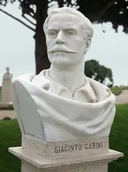 The wound caused by a bullet in 1860 could no longer heal, bringing torments and pains.[1] He died in Rome on January 16, 1880 : in 1912 the body was moved to his hometown, in the church of San Domenico [1] ; a marble bust was dedicated to him inside the Falcone-Morvillo villa, in viale della Libertà in Palermo,[1] and at the base of this sculpture there is an epigraph that reads these words: "To general Giacinto Carini, who magnanimous in exile, in the brave fight among the thousand, the mind the arm the heart, sacred to Italy[6] Also in Rome on the Janiculumthere is a Bust of Giacinto Carini. Rome and Padua have dedicated a street to him.