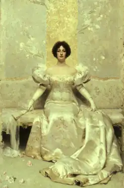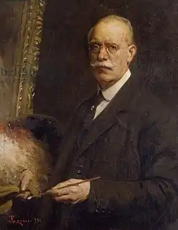 After spending his childhood at Glaveno seminary, Giacomo Grosso enrolled at the Accademia Albertina in Turin in 1873, thanks to a scholarship he was awarded by Cambiano Town Council. He became a pupil of Andrea Gastaldi and made his debut in 1882 at the 24th Esposizione della Società di Incoraggiamento alle Belle Arti di Torino, completing his studies the following year. In 1884, he participated in the Esposizione Generale Italiana in Turin with a painting inspired by La storia di una capinera by Giovanni Verga. After coming into contact with the Paris art scene through his many stays in the French capital, he continued to exhibit assiduously in the Turin Promotrici, the Venice Biennale from the first edition in 1895 (with a one-man show in 1912), and in other international shows (Paris, 1896; Munich, 1899; San Francisco, 1915) where he became acclaimed as a portraitist. From 1901 when he made his first journey to South America he began to receive commissions from Argentina and in 1910, for the celebration of the Argentinean Centennial in Buenos Aires, he executed a large commemorative canvas The panorama of the Battle of Maipú (lost in the fire in 1923), an episode in the War of Independence.[1] From 1906 he held the chair of painting at the Accademia Albertina in Turin and in 1929 he was nominated senator of the Kingdom of Italy. His solo exhibition of over fifty works was curated by Leonardo Bistolfi at the Galleria Pesaro, Milan, in 1926.
