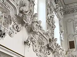 His stucco work for the oratories follows a general formula, but each elaboration is its individual tour de force. Two of the oratories are dedicated to the rosary, and the wall is divided into a series of tableaux or dioramas, each matching a Mystery of the Rosary, above these are allegorical figures or a fecundity of cherubs in playful frolic. The tableaux develops a program of prayer images, like a via crucis for contemplative prayer. The Santa Cita oratory is remarkable for its dioramas, coupled with almost genre like figures calling our attention from the moldings on which they perch. Between the doors entering the oratory is a remarkably detailed depiction of a naval battle, referencing the Battle of Lepanto. In the frames above and below are a trophy of arms, including helmets and body armor, and a Hapsburg eagle spreads its wings.