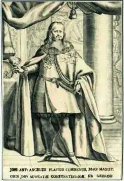 Arianitto died on 16 November 1551, ending the male line of the Arianiti family in Italy.[11] Arianitto's titular position as the 'Prince of Macedonia' was taken up by Andrea Angeli, an Italian nobleman.[12] Andrea was the grandson of Dorothea Arianiti, an aunt of Constantine Arianiti,[13] meaning that he was Arianitto's third cousin.[11] Andrea's family, the Angelo Flavio Comneno, claimed to be direct descendants of the Angelos dynasty of Byzantine emperors.[14] This claimed descent is considered unlikely, especially given the forged genealogies published by the family. It is however possible that the family's earliest known member, the Albanian noble Andres Engjëlli (or "Andreas Angelos"), active in the 1480s,[15] was descended from less well known children or cousins of the Angeloi emperors[16] or perhaps descended through a female line.[17] Andrea Angeli's claims were accepted in Western Europe without much dispute and he was officially acknowledged as a descendant of the Angelos dynasty by Pope Paul III (r. 1534–1549) and guaranteed the right to inherit territories in the former Byzantine Empire, should they be recovered from the Ottomans.[18] The Angeli Flavio Comneno family thus for a time reached an unusually prominent position for self-claimed Byzantine descendants.[14] Andrea and his brother Paolo founded their own chivalric order, the Sacred Military Constantinian Order of Saint George, with invented connections to Byzantium. Andrea and Paolo claimed that the order was not their recent creation but that it instead was of ancient origins, depending on the account founded either by Constantine the Great in the 4th century or by the later emperor Heraclius in the 7th century. The authenticity of the order was soon widely accepted throughout Europe.[19] The last male member of the Angelo Flavio Comneno family, Giovanni Andrea II Angeli, transferred the rights of the Constantinian Order in 1698 to the unrelated Francesco Farnese, the Duke of Parma, and his descendants.[20] Farnese's rights to the order were confirmed by Pope Innocent XII (r. 1691–1700) and Holy Roman Emperor Leopold I (r. 1658–1705).[20][21]
