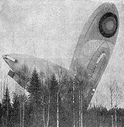 On 10 February 1915, in the Gatchina area, flight tests of the "Giant" began. During the first flight, at a low altitude, the airship bent severely in the middle, and a rotating propeller caught one of the cables supporting the engine gondolas. This caused the airship to bend further and fall to the ground.[2]