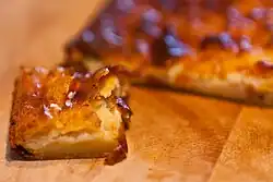 This is a baked pancake-like dish, similar to the Italian farinata, also known in Genoa as fainâ and in Uruguay and Argentina as fainá, and in the Nice region of France as socca. It is made with chickpea flour, water, olive oil, salt and pepper.