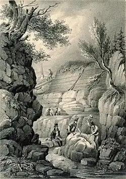 He returned to Lewes, and immediately formed a partnership with his former master, James Moore. In the wake of the cholera, typhoid and smallpox epidemics, Mantell found himself quite busy attending to more than 50 patients a day and delivering between 200 and 300 babies a year.[11] As he later recalled, he would have to stay up for "six or seven nights in succession" due to his overwhelming doctoral duties. He was also able to increase his practice's profits from £250 to £750 a year.[12] Although mainly occupied with running his busy country medical practice, he spent his little free time pursuing his passion, geology, often working into the early hours of the morning, identifying fossil specimens he found at the marl pits in Hamsey.[13] In 1813, Mantell began to correspond with James Sowerby. Sowerby, a naturalist and illustrator who catalogued fossil shells, received from Mantell many fossilised specimens. In appreciation for the specimens Mantell had provided, Sowerby named one of the species Ammonites mantelli.[14] On 7 December, Mantell was elected as a fellow of the Linnean Society of London. Two years later, he published his first paper, on the characteristics of the fossils found in the Lewes area.[15]