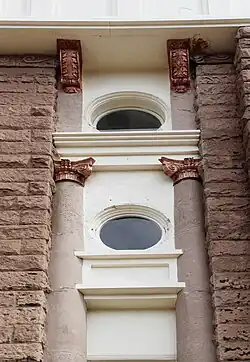 The building exterior is constructed of locally quarried stone. Brick is used for interior bearing walls, and the floors and roof are framed and sheathed in wood. The classical details, including the frieze, cornice, and window details are of pressed metal.[2]