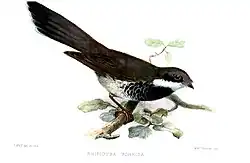 The Gilolo fantail was formally described and illustrated in 1865 by the British naturalist Alfred Russel Wallace based on a specimen collected on the summit of the Gamalama volcano on Ternate in the Maluku Islands. He placed it with the other fantails in the genus Rhipidura and coined the binomial name Rhipidura torrida.[1][2] The specific epithet is from Latin meaning "scorched", "torrid" or "burning".[3] The Gilolo fantail was formerly considered as a subspecies of the rufous fantail (now the Australian rufous fantail) (Rhipidura rufifrons) but is now treated as a separate species based on differences in the plumage, voice and genetics.[4][5] The species is monotypic: no subspecies are recognised.[5]