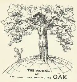 Scouting's founder Robert Baden-Powell was inspired by the oak to write "the moral of the acorn and the oak" in around 1929 that held that "big things were possible from modest beginnings".[7][3][8] Baden-Powell said that the growth of the oak from humble acorn to mighty tree was analogous to the growth of Scouting from the 1907 Brownsea Island Scout camp to a worldwide organisation and the similar personal growth of a young person passing through the movement.[3]
