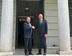 The first official visit abroad Gerapetritis went on was to Cyprus on 4 July.[7][8] He was initially received by President Nikos Christodoulides, before meeting with his counterpart the Cypriot Foreign Minoster Constantinos Kombos.[8] In joint statements with Kombos, Gerapetritis stated that the Cyprus issue was a "top national foreign policy priority" for Greece, and also said that the solution must be "functional and grant the reunited Cyprus Republic the future it deserves."[9] Gerapetritis also stated that they were living in "historic moments" and that the circumstances were "significant" and quite "challenging regionally and internationally."[8] Additionally, Gerapetritis also discussed the steps taken by Greece and Cyprus in building deeper ties with regional allies, particularly Israel.[8]