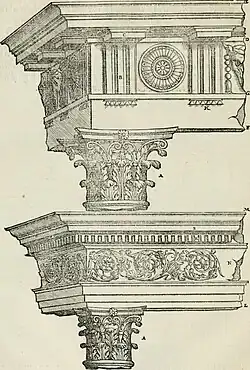 Rusconi's “Vitruvius” was only printed after his death in 1590 by the son of his former editor Giolito. Although the latter recognised the value of Giovan Antonio's xylographies he considered his translation and annotations as outdated, and thus a strange “Vitruvius without Vitruvius“ was published:[2] Just about 160 of originally 300 woodcuts were compiled with extracts from Fra Giocondo's and Cesariano's translations of Vitruvius’ treatise. For many of Rusconi's illustrations containing references to textual explanations, it is particularly regrettable that his translation has hence been lost.[3]