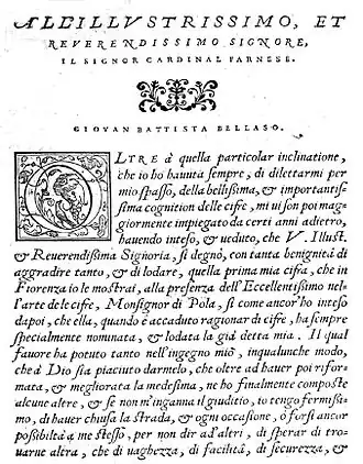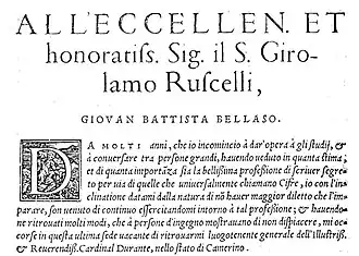- Bellaso, Giovan Battista, La cifra del Sig. Giovan Battista Bel[l]aso, gentil’huomo bresciano, nuovamente da lui medesimo ridotta à grandissima brevità et perfettione, Venetia 1553.