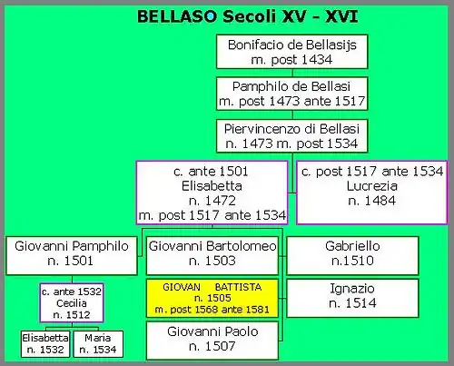 Bellaso was born of a distinguished family in 1505. His father was Piervincenzo, a patrician of Brescia, owner since the 15th century of a house in town and a suburban estate in Capriano, in a neighborhood called Fenili Belasi (Bellaso's barns), including the Holy Trinity chapel. The chaplain was remunerated each year with a regular salary, and a supply of firewood. The family coat of arms was ‘‘On a blue field three red-tongued gold lion heads in side view”.