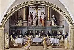 Sogliani later entered some sort of partnership with Fra Bartolomeo's workshop at San Marco, monogramming his Annunciation at Santa Maria degli Innocenti, Florence, with Fra Bartolomeo and Albertinelli's workshop monogram "orate pro pictor" ("pray for the painter").[2] On his own, Sogliani completed, among other works, the Martyrdom of Saint Acacius (1521) for San Salvatore di Camaldoli (now in the basilica of San Lorenzo, Florence) and the fresco of the Miraculous Meal of Saint Dominic (1536) in the refectory of the convent of San Marco. Other important works include a panel of Saint Martin for a pillar at Orsanmichele and the altarpiece of Saint Bridget of Sweden Confirming her Rule (1522) for the convent of Santa Brigida al Paradiso, now at the Museo di San Marco.