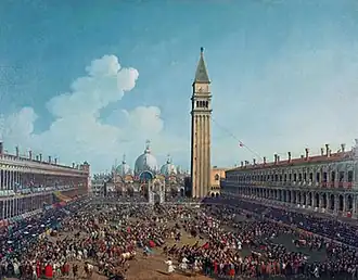 Important early patrons of Cimaroli were Marshal Schulenberg, Count Tessin of Sweden, and the British merchant and diplomat settled in Venice, Joseph (Consul) Smith.[8] It was through the disposition of Consul Smith's art collection, hand-picked by Smith for King George III,[9] that six landscapes by Cimaroli entered the Royal Collection, of which three oval views survive.[10] Cimaroli, despite the esteem of contemporaries, was nearly forgotten until the mid-twentieth century,[9] but has undergone a revival of critical interest, typified by the publication of the first catalogue raisonné of his paintings.[3]