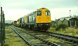 Girvan Old had a single platform. The goods station had a number of buildings including a turntable, water column, weighing machines, engine shed that closed in 1940[7] and a coal yard with a bridge over the River Girvan that led to the harbour and jetty.[8][9] The track was still in situ in 1989 however it had been lifted by 2014.[10] The old Girvan terminus went out of use in the 1980s due to the poor condition of the wooden bridge over the River Girvan although ballast trains were still making use of the site.[11]